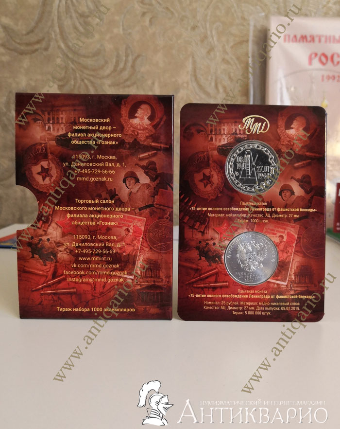 Блистер оформлен в красных тонах, символизирующих Знамя победы. Красный закат на фоне тихих вод Невы подразумевает наступление мирной жизни ленинградцев. Не обошли вниманием художники-оформители и известные каждому достопримечательности города: Петропавловский шпиль, Исаакиевский собор, Медного всадника и неповторимы разводные мосты. Второй имеет такие же красные тона, но картинки подобраны по тематике ВОВ и блокады. Монета достоинством 25 руб. представляет собой серебристый диск с символичным изображением ленинградского разводного моста. По его краю располагается надпись: «75-летие полного освобождения Ленинграда от фашистской блокады». Другая сторона традиционно имеет государственный Герб и указание номинала вдоль края монеты. Жетон представляет собой серебристый диск и имеет два варианта. Первый - с изображением автомобиля «полуторка» и надписью «Ледовая дорога жизни». Второй – с хронометром и датами начала и окончания блокады. Цена всего комплекта гораздо ниже рыночной и самая низкая по Москве. Это самый лучший подарок, который может получить нумизмат с любым стажем и коллекцией. Это прекрасный сувенир для людей, переживших эти ужасные дни в фашистском кольце. Заказывайте, и вскоре этот набор станет изюминкой Вашей коллекции. |