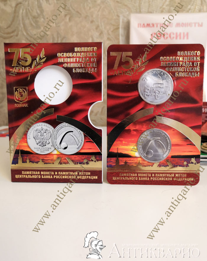 Главная → Монеты → Юбилейные монеты России → Монеты памятных дат → Официальный буклет - 75 лет освобождения Ленинграда от блокады - монета и жетон ММД