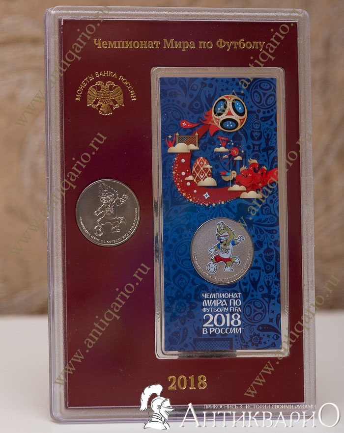 Отличный подарочный набор в прозрачном пластиковом буклете с 2-мя монетами Банка России номиналом по 25 рублей (простой и цветной) с изображением Талисмана чемпионата мира по футболу в России 2018 - Волка Забиваки.