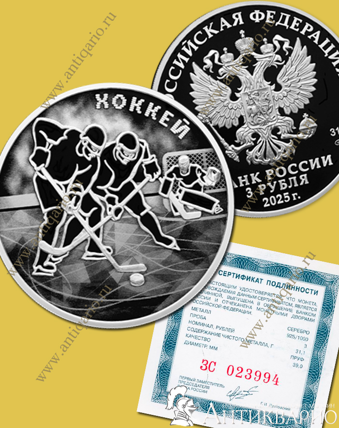 Хоккей - 3 рубля 2025 / серебро, пруф