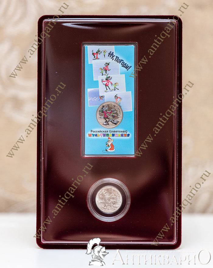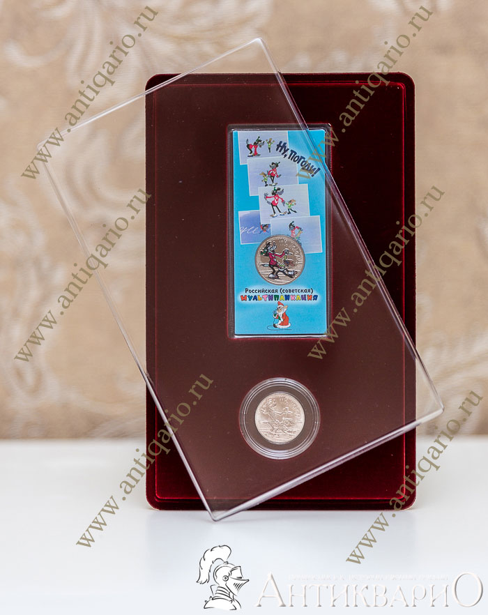 Главная → Монеты → Юбилейные монеты России → Российская (советская) мультипликация → Набор 2 монеты Ну погоди! (простая+цветная) в бархатном планшете