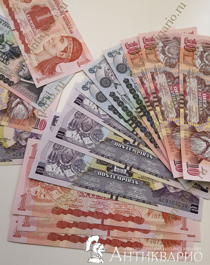 | Красивые бумажные деньги из далекой и экзотической страны Центральной Америке - Гондурас. Номинал банкнот составляет 1, 2, 5 и 10 гондурасских лемпир. Купюры образца 2014-2016 годов выпуска. Все бумажные купюры отличного качества ПРЕСС из банковской пачки! Национальная валюта Гондураса - это лемпира, денежная единица, которая равна 100 сентаво. Введена в обращение в 1931 году. Это по аналогии с нашим российским рублем т.е. 1 рубль = 100 копейкам. Комплектация набора бумажных купюр Гондураса: