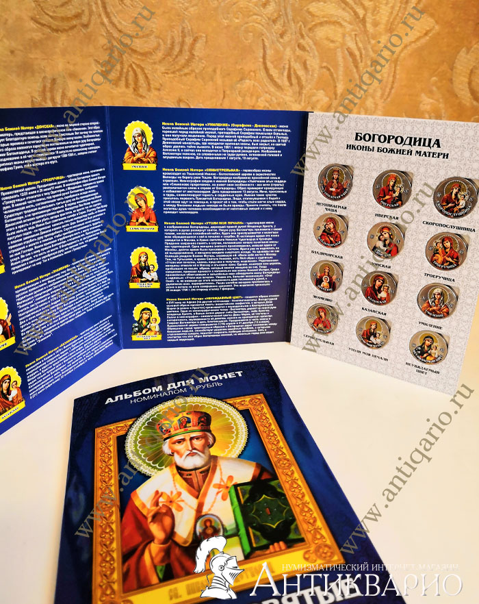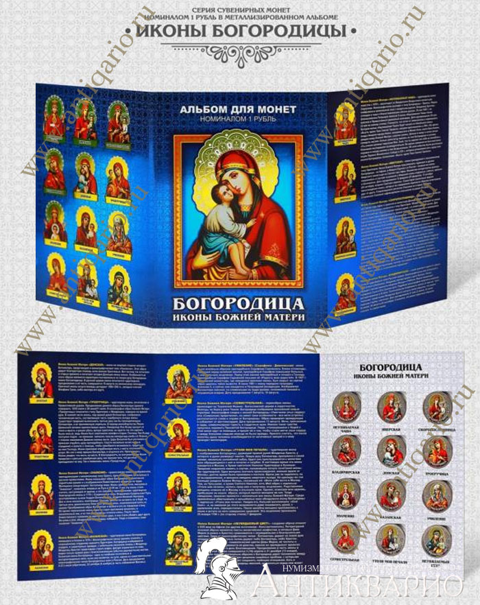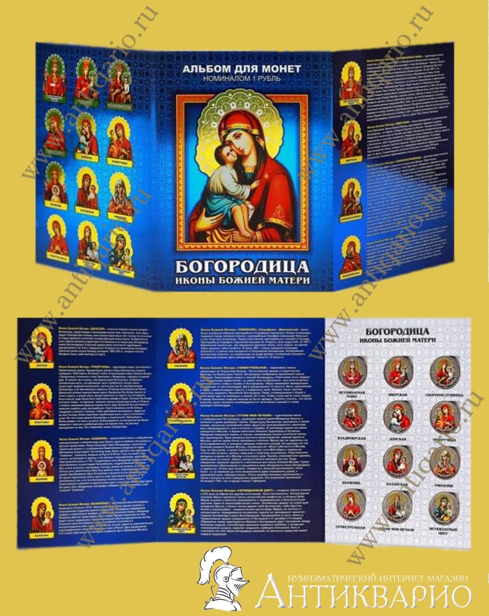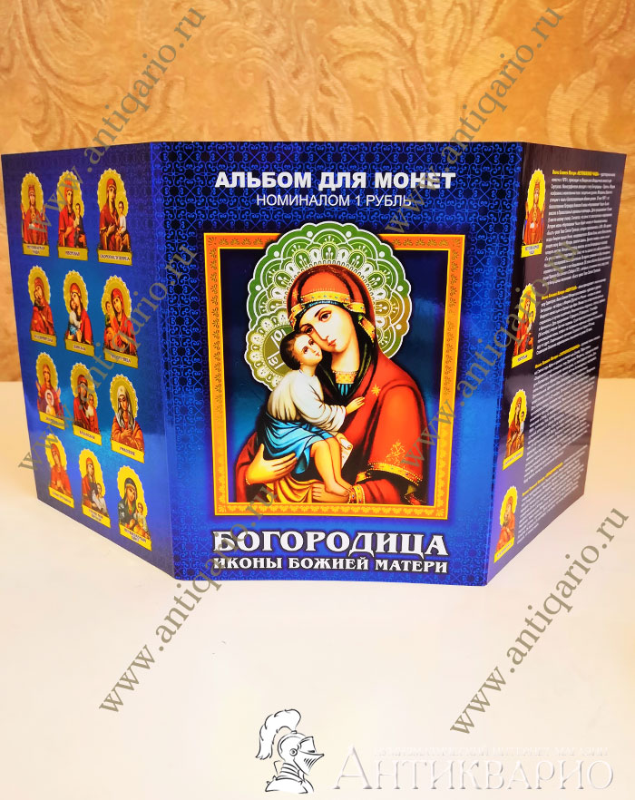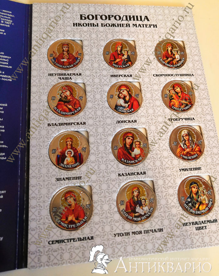 Набор цветных монет с изображением икон Богородицы Божией Матери, размещенные в красивый тематический альбом. В набор входит 12 монет. На банковскую монету 1 рубль нанесено цветное изображение иконы Богородицы. Данный набор монет является малотиражным авторским выпуском. Самые современные технологии и оборудование, фото гравировка, эпоксиакрилатная эмаль, стойкая к выгоранию и истиранию.